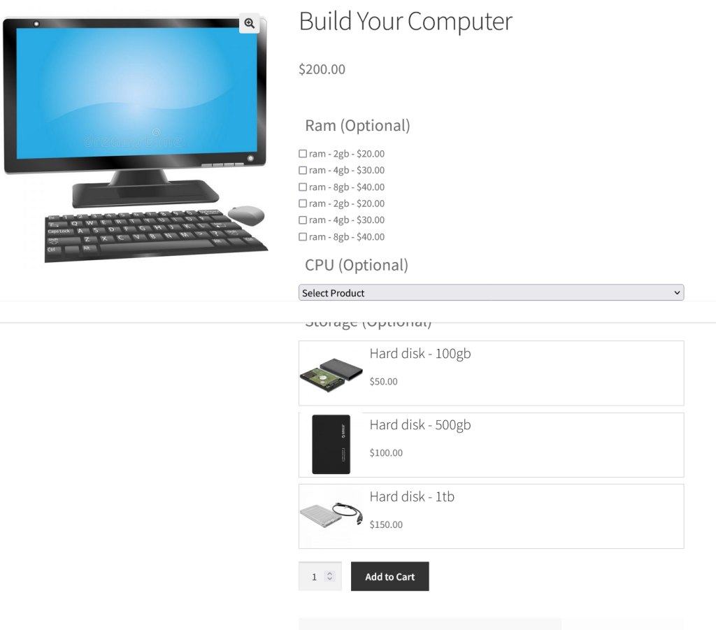 • Show products in radio buttons, drop-down, or in boxes.