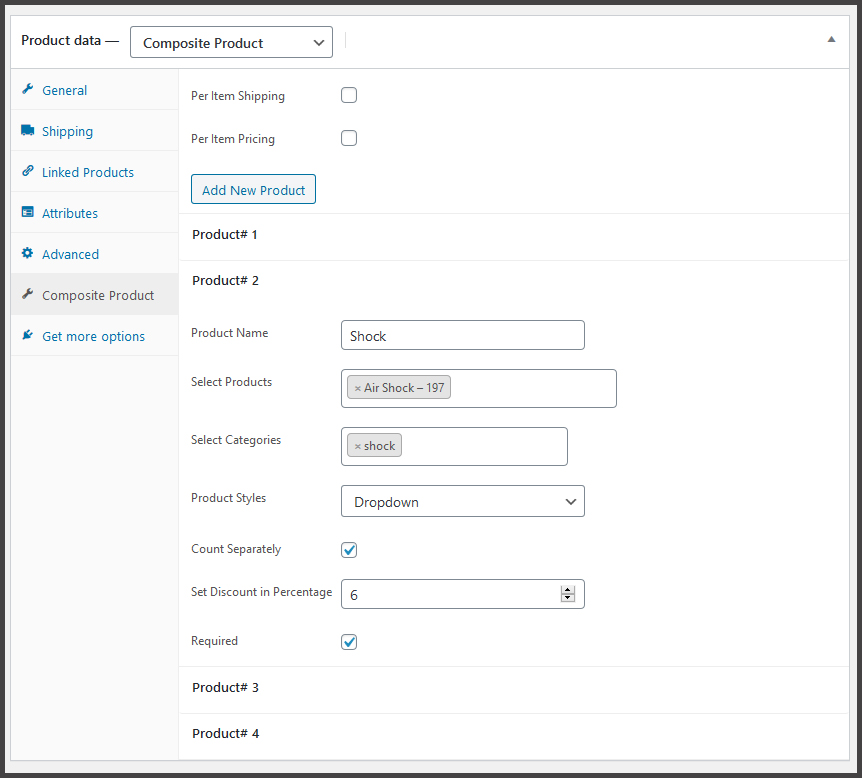 When you visit the product page, add a new product, select the Composite Product from product data. For instance, you will be able to add multiple components. However, you can add individual products for each component and categories as well. Furthermore, you can also set the type of the component. You can set one of three options for items display as a field either, drop-down, radio buttons, or boxes of items. After that, you can set a discount for components in percentage as well.